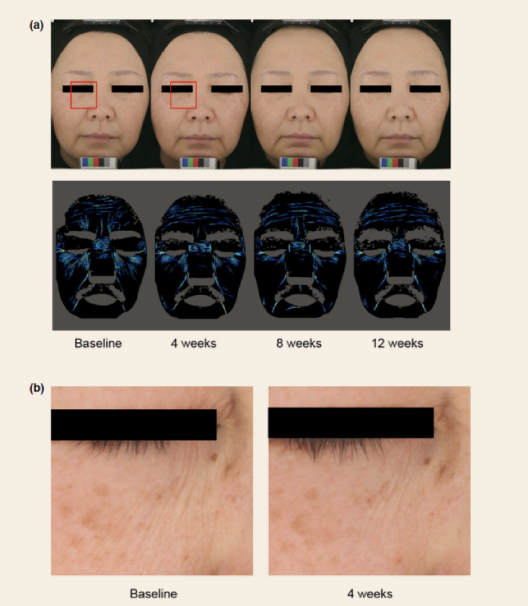 Effect of retinol treatment on facial skin appearance the analysis of the skin biopsies demonstrated that both retinol and retinoic acid treatments increased epidermal thickening, upregulated gene expression related to skin functions, and increased collagen synthesis in skin. Based on these results, the effect of a 0.1% retinol formulation on facial wrinkles. Full face images were obtained from the female subjects during the 12-week retinol treatment period (Fig. a&b) and the extent of facial wrinkles were analyzed using the proprietary F.A.C.E.S. software. A wrinkle score was calculated to reflect both wrinkle number and severity. 15 The facial wrinkle analysis showed a significant reduction in wrinkle scores following retinol treatment over the 12-week period (Fig. a&b). Wrinkle reduction was observed as early as 4 weeks, with a wrinkle score reduction of 58.68% at the cheeks and 27.93% in eye areas (Figs 5b and 6). Wrinkle scores were reduced by 63.74% at the cheeks and 38.74% in the eye areas after 12 weeks of treatment.